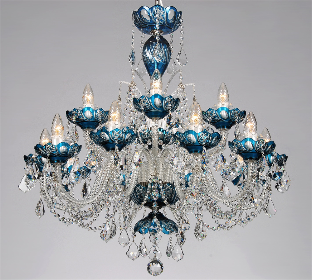 Mẫu đèn luxus được sử dụng các phụ kiện làm từ pha lê màu Bohemia thổi thủ công và hạt dây trang trí Swarovski.